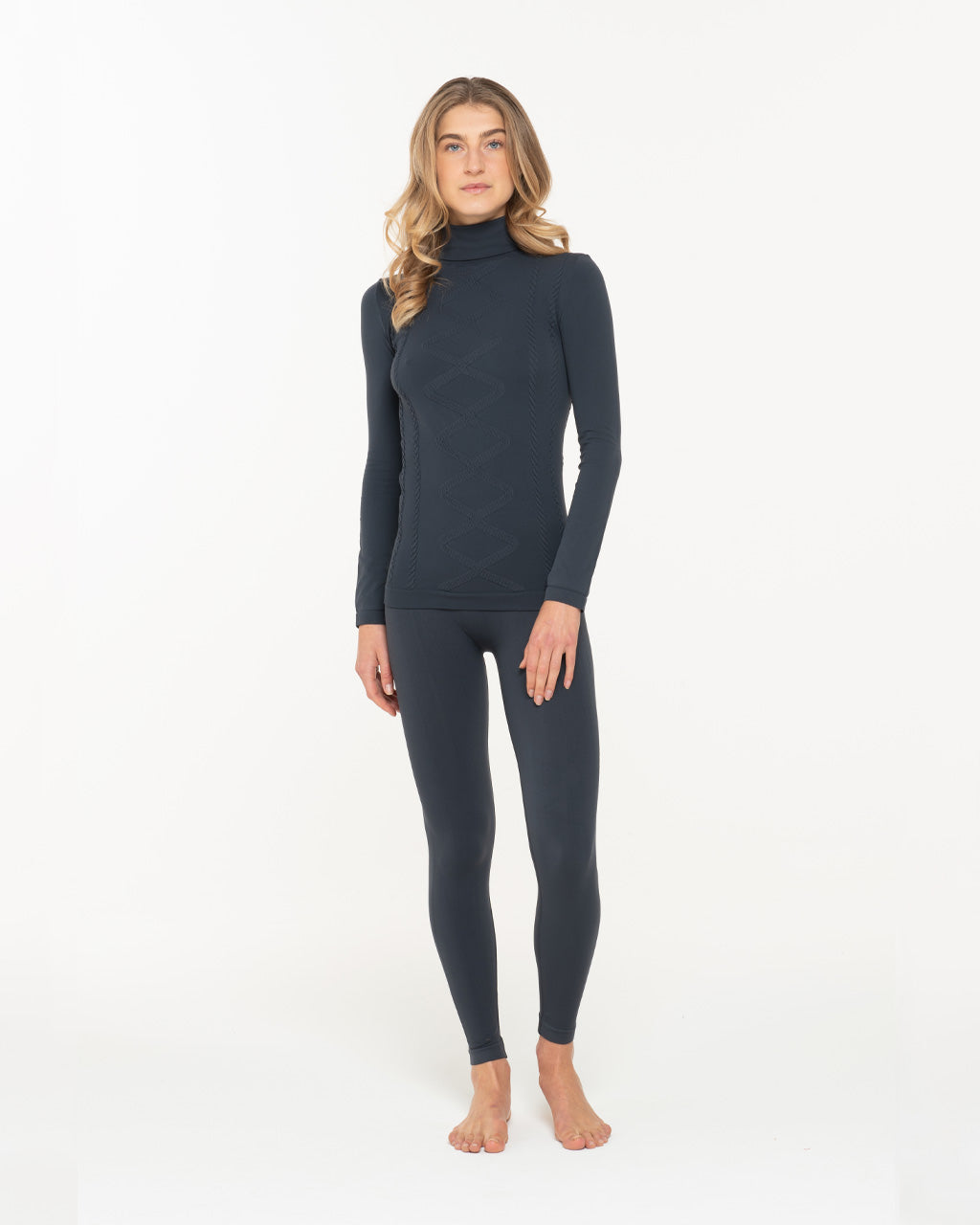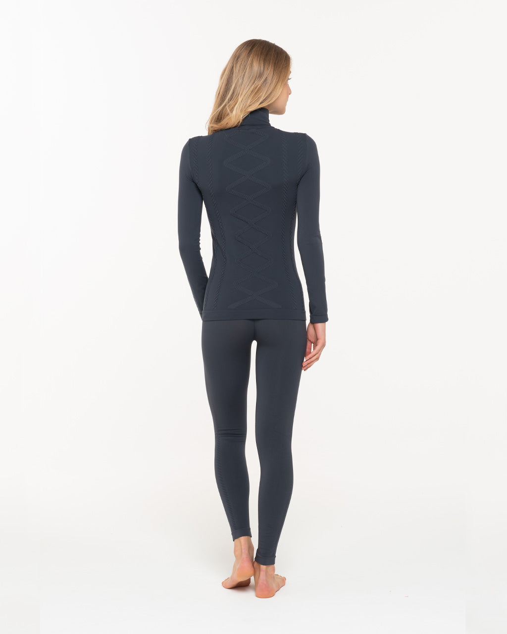 Thermal set consisting of a long-sleeved turtleneck sweater and high-waisted leggings with a shape-up effect that enhances the side B. Breathable in microfiber suitable for all winter sports activities. It is designed for dressing in layers. It is versatile, it can be used as a base layer for mountain activities, for sports in the city or simply to keep you warm during your daily routine. The intertwined design makes a technical garment finally elegant.