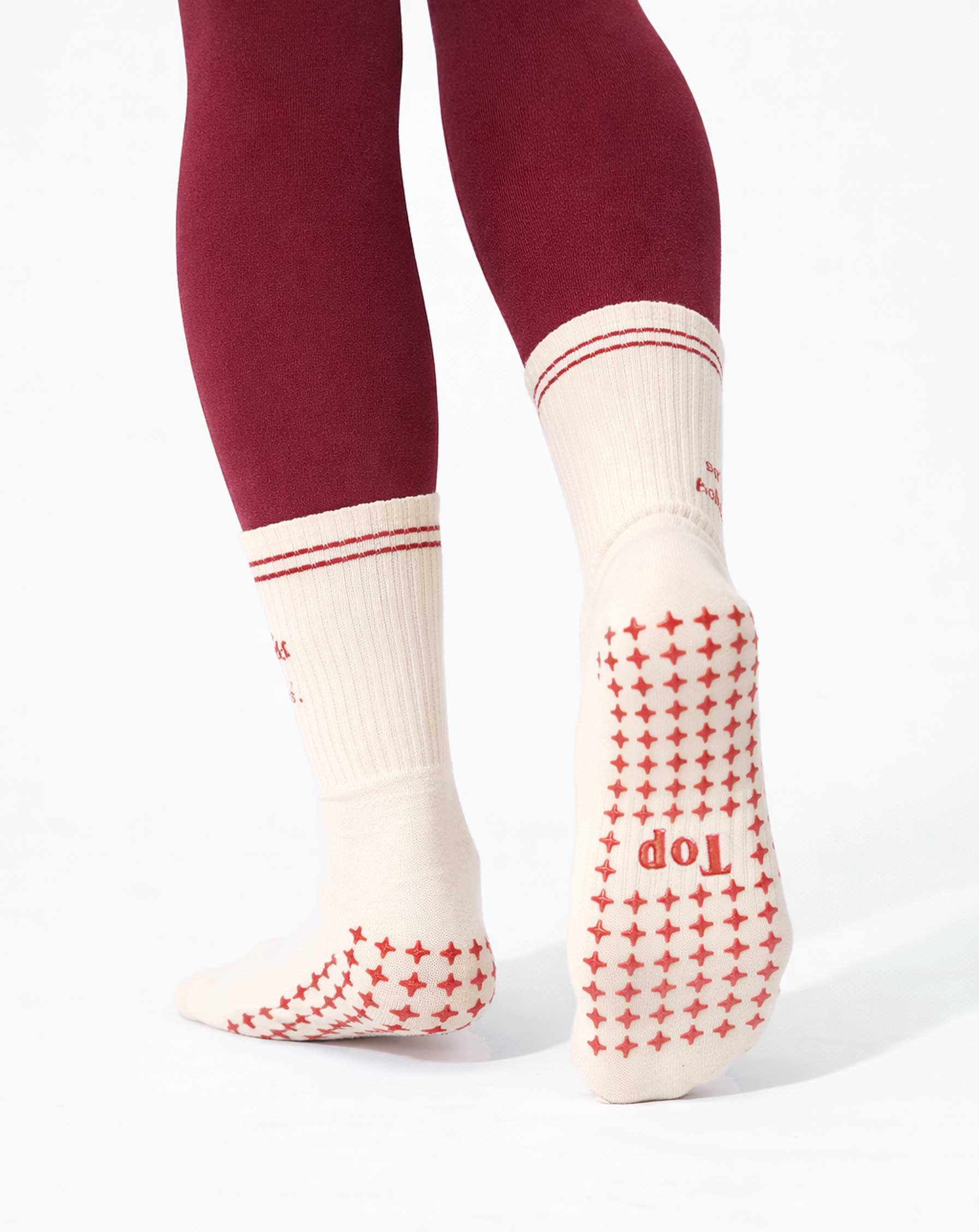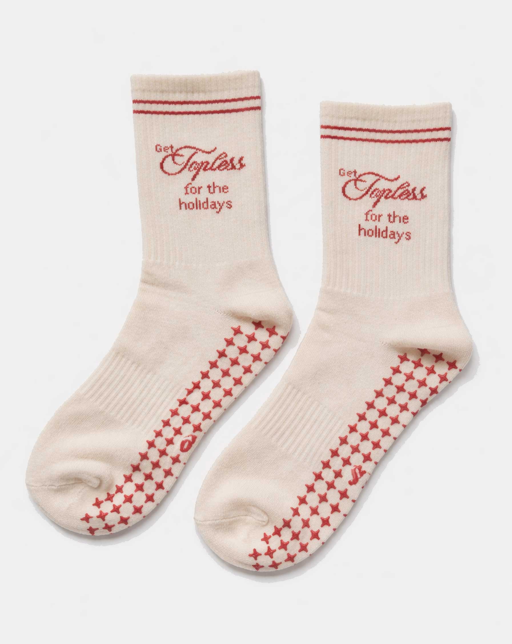 Trova il tuo equilibrio con i calzini antiscivolo “Get Topless for the holidays”. Realizzati in morbido cotone elasticizzato, offrono comfort e traspirabilità ideali per yoga, pilates o momenti di relax in casa.