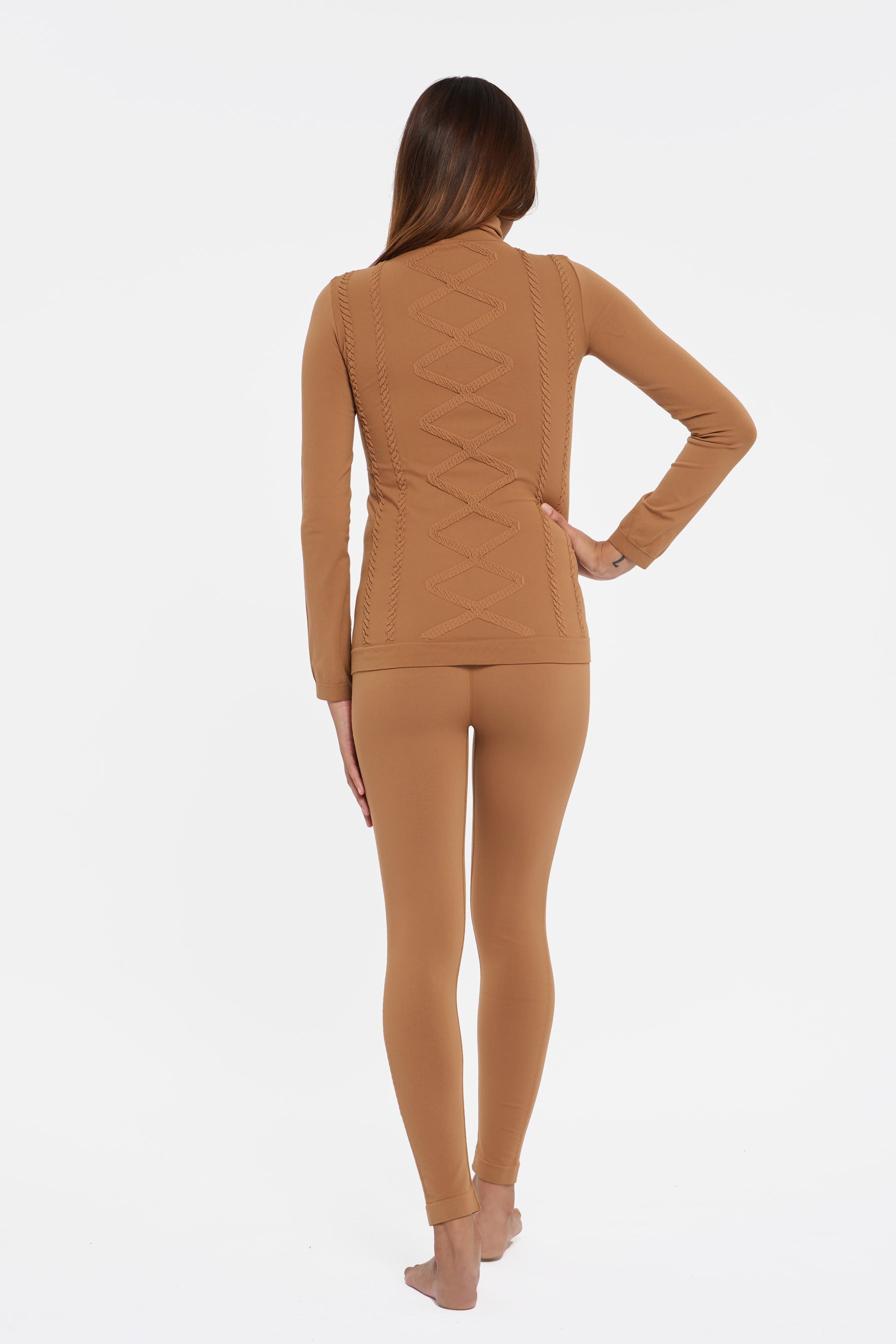 Completo termico composto da maglia dolcevita a maniche lunghe e leggings a vita alta con effetto shape up che valorizza il lato B. Traspirante in microfibra adatto a tutte le attività sportive invernali.E’ ideato per vestirsi a strati. E’ versatile, si può usare come layer di base dei look per le attività in montagna, per praticare sport in città o semplicemente per mantenerti al caldo durante la tua routine giornaliera. Il design ad intrecci rende un capo tecnico finalmente elegante.
