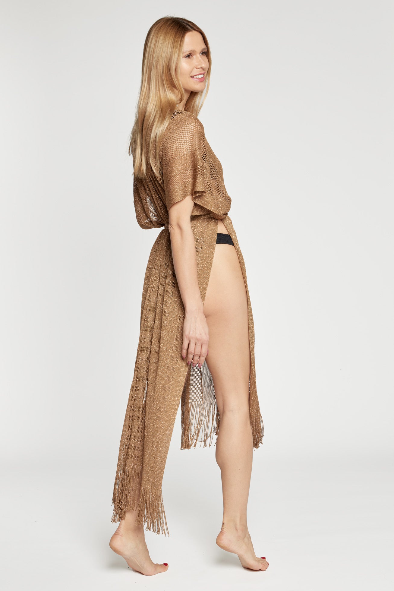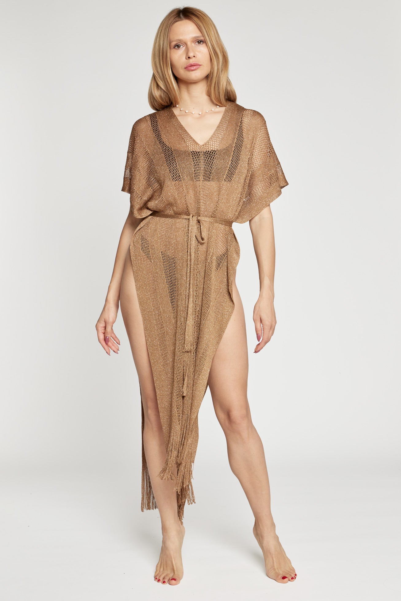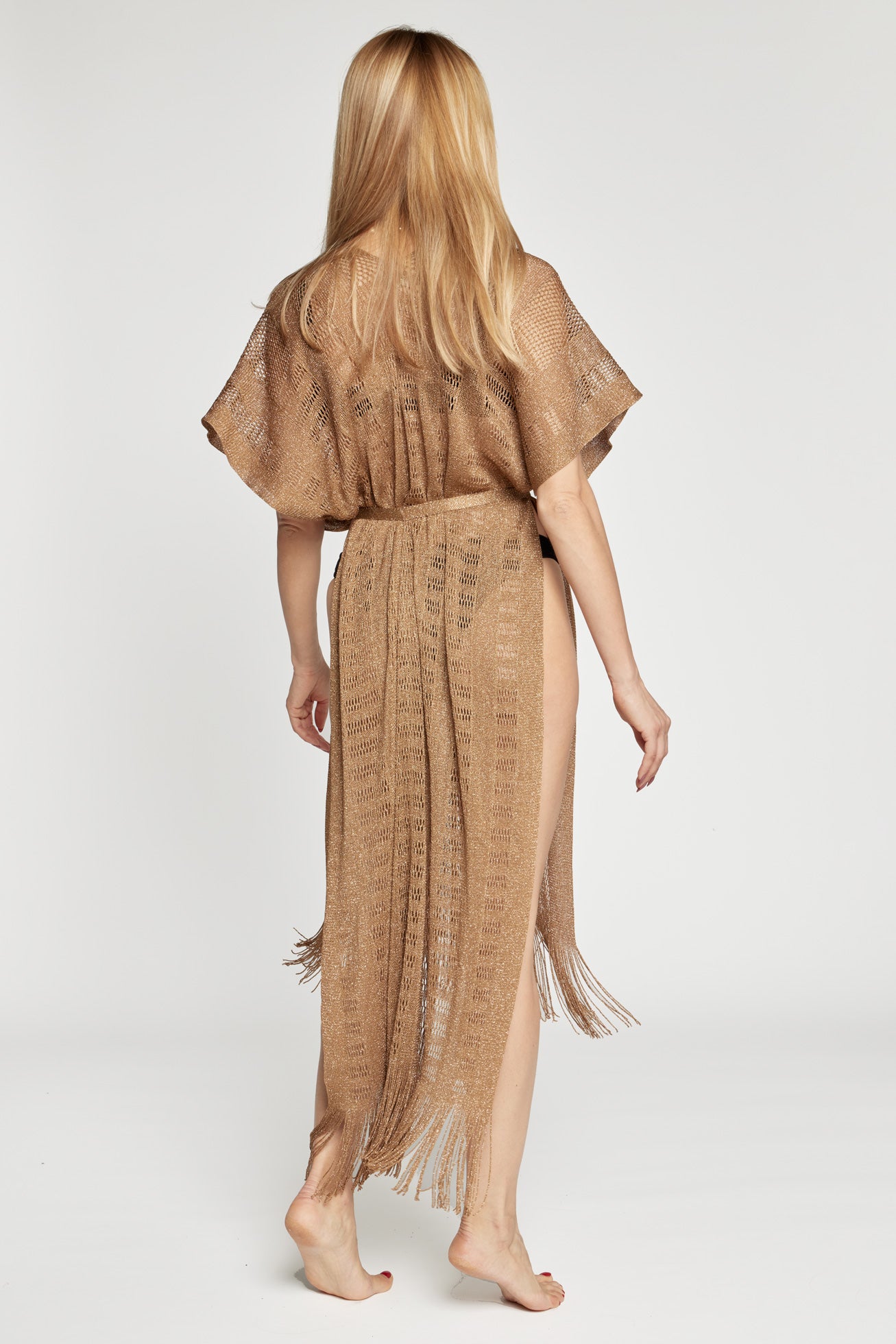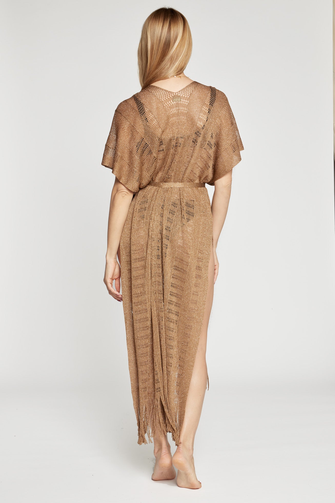 Caftano lungo a rete con scollatura a V davanti e dietro, con cintura in vita e frange finali.