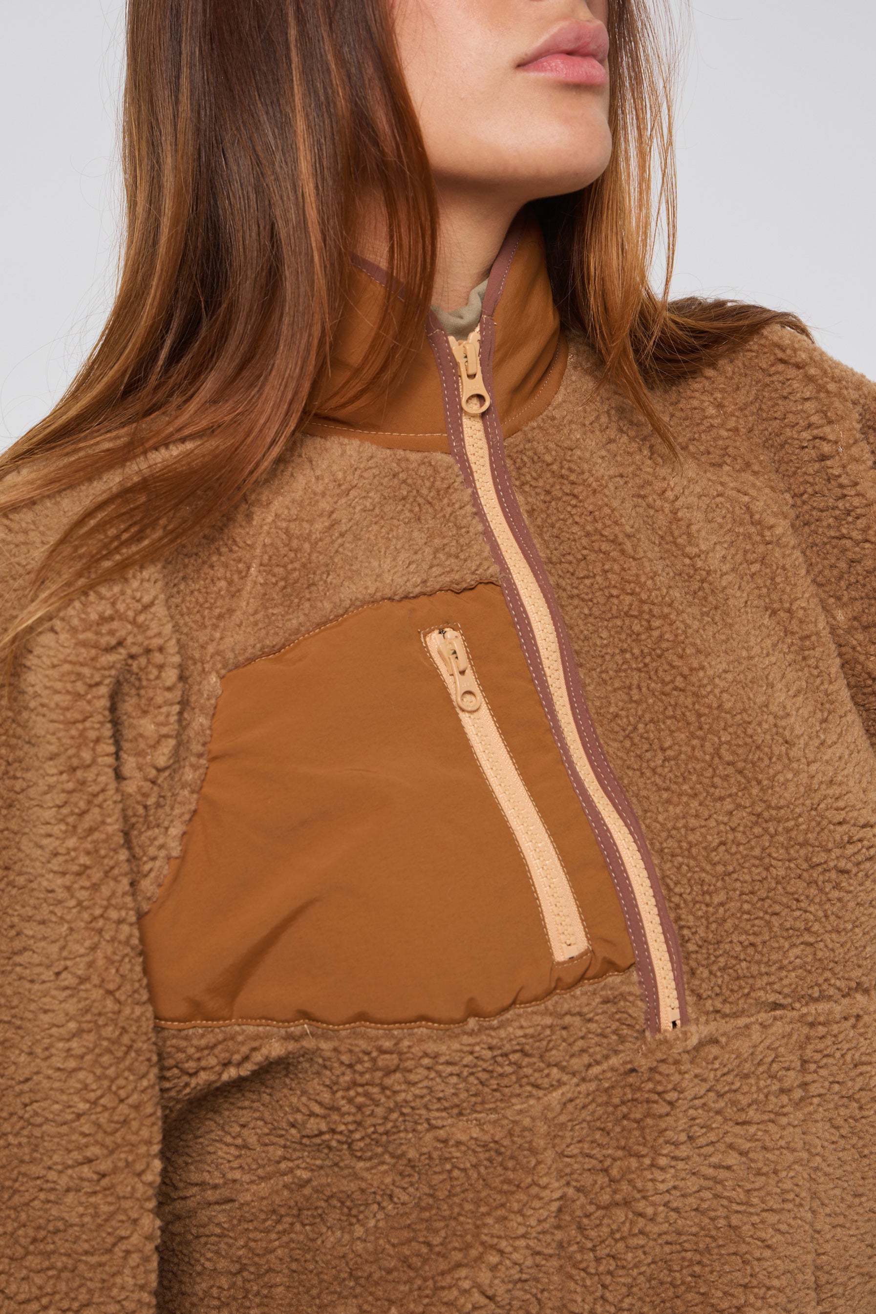 Vestibilità: fit leggermente over, con spalle ampie e maniche comode, ma taglio corto per un look contemporaneo. Ll fondo è dotato di un elastico regolabile con fermacorda, che permette di adattare la chiusura sotto il pile per trattenere meglio il calore e personalizzare la vestibilità.