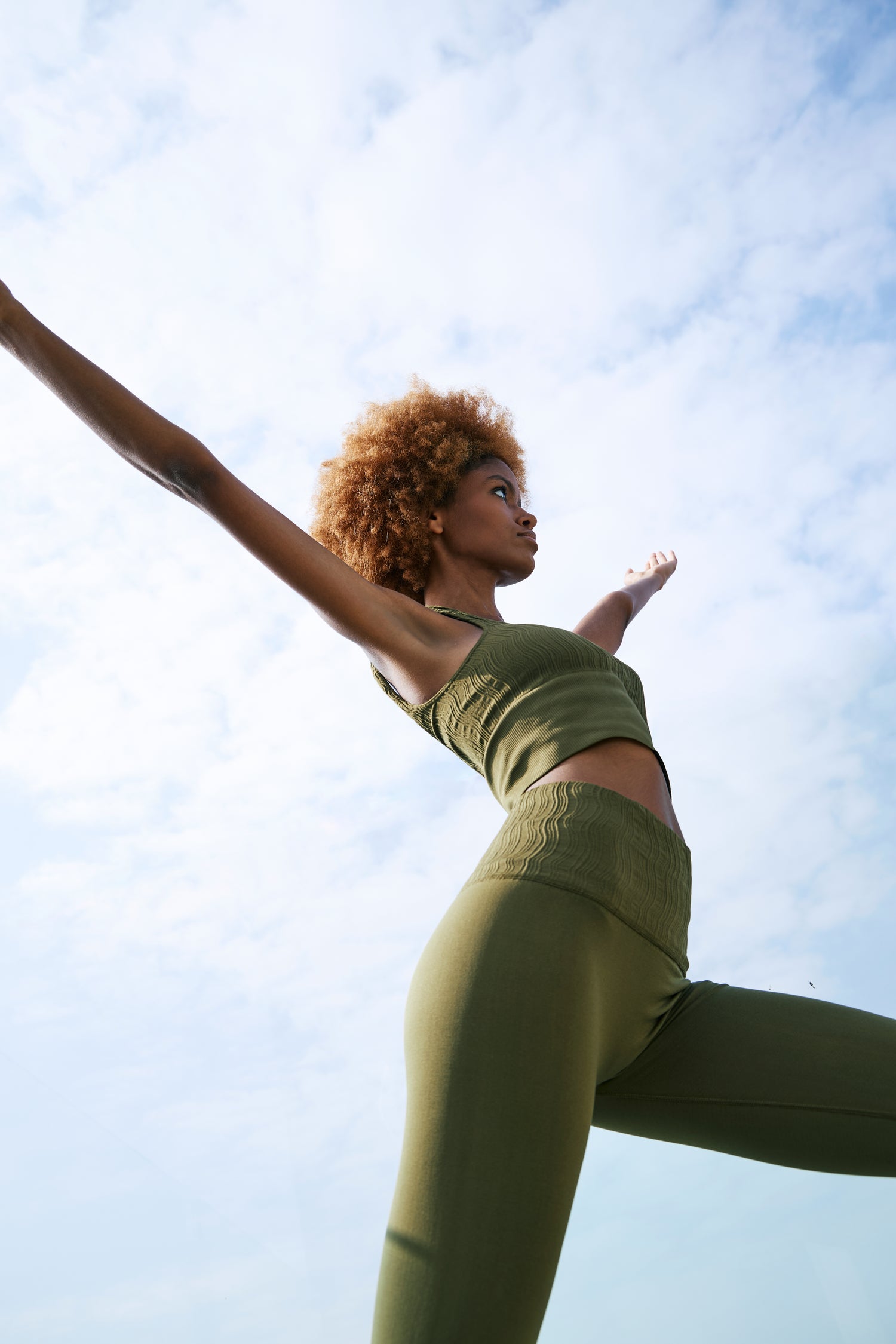 La linea Flow, pensata per il fitness e lo yoga, si distingue per la caratteristica lavorazione ondulata del tessuto.